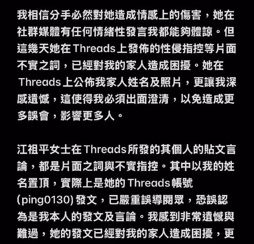 並指江祖平在Threads所發貼文均為片面之詞與不實指控,除請對方撤銷下不實發文外,並願意進行司法調查。