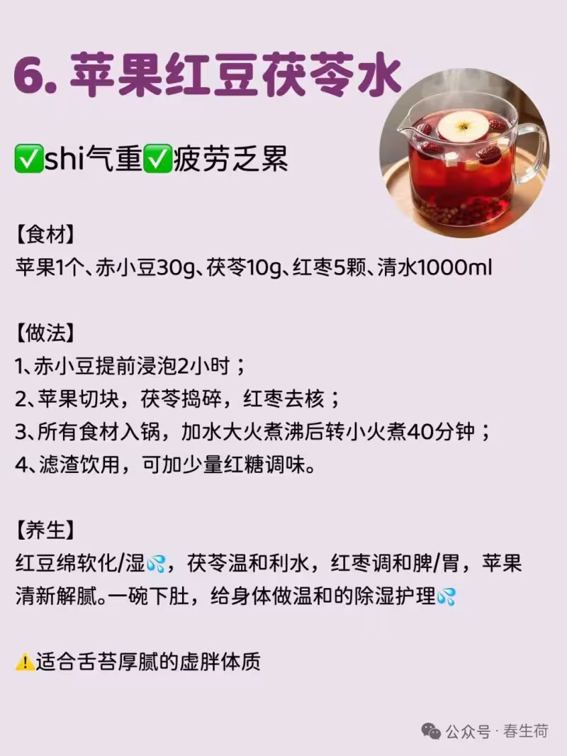 赤小豆提前浸泡 2 小時,蘋果切塊,茯苓搗碎,紅棗去核,所有食材入鍋,加 1000ml 清水大火煮沸後轉小火煮 40 分鐘,濾渣飲用,可加少量紅糖調味。