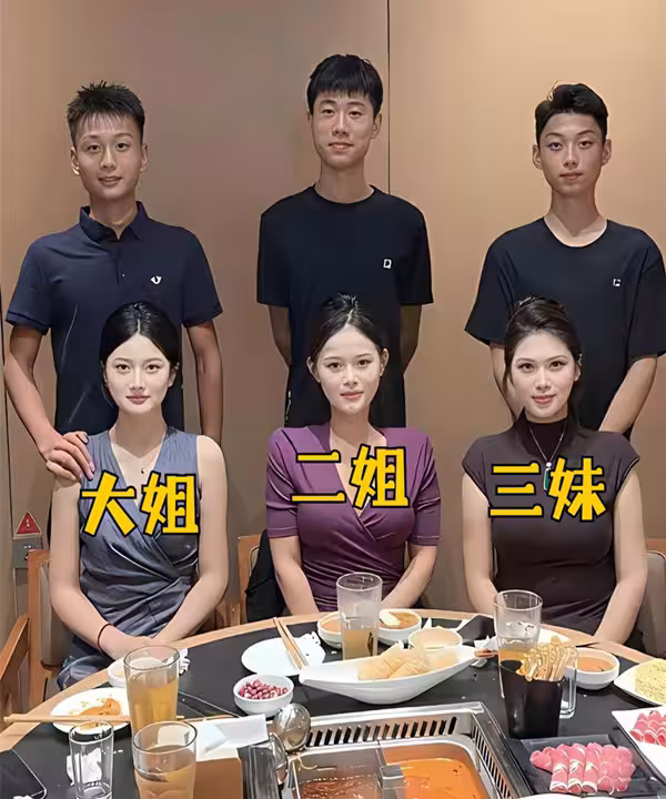 照片拍攝於一家飯店,三姐妹容貌極為相似,並排坐在餐桌前,笑容甜美。