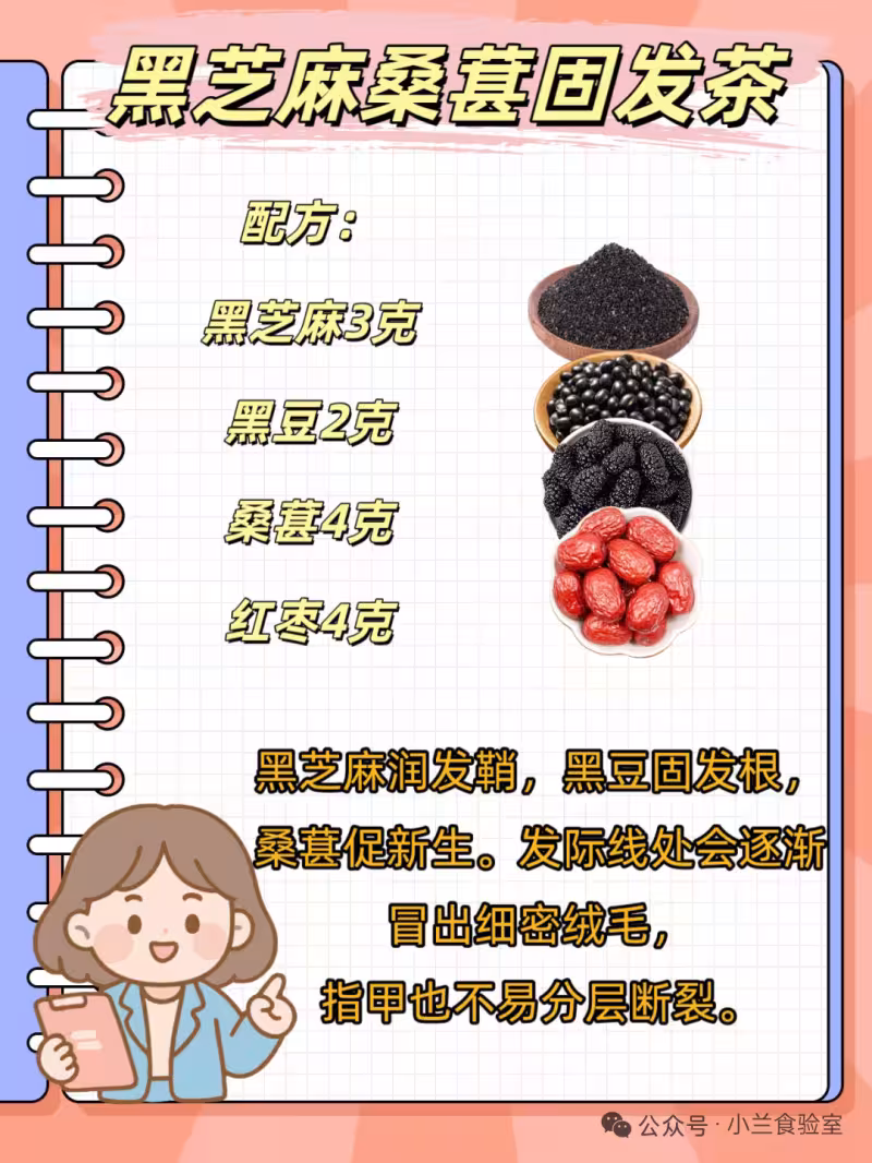 黑芝麻潤發鞘,黑豆固髮根,桑葚促新生。髮際線處會逐漸冒出細密絨毛,指甲也不易分層斷裂。適合熬夜臉黃、抗老需求強的"夜貓子"。