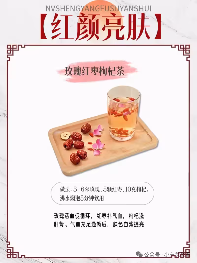 🧂做法:5-6朵玫瑰、5顆紅棗、10克枸杞,沸水燜泡5分鐘飲用