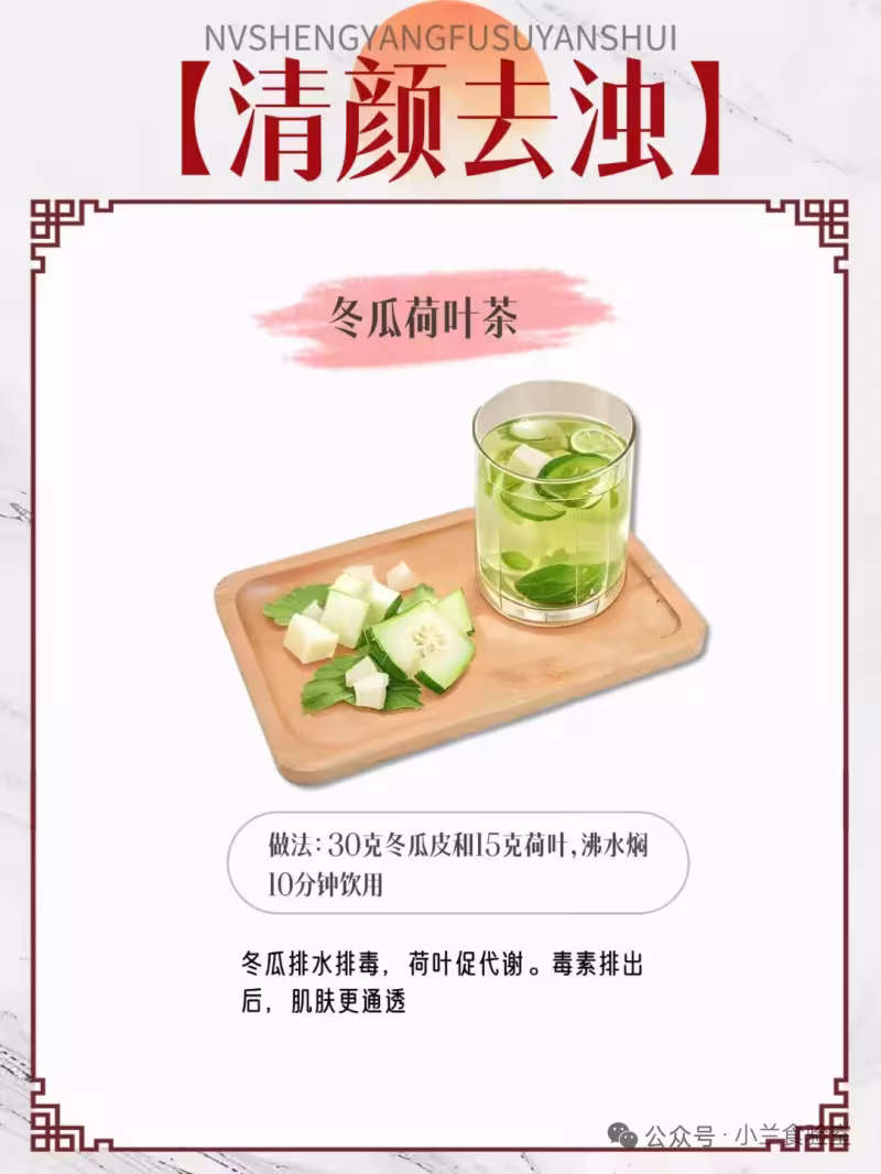 🧂做法:30克冬瓜皮和15克荷葉,沸水燜10分鐘飲用