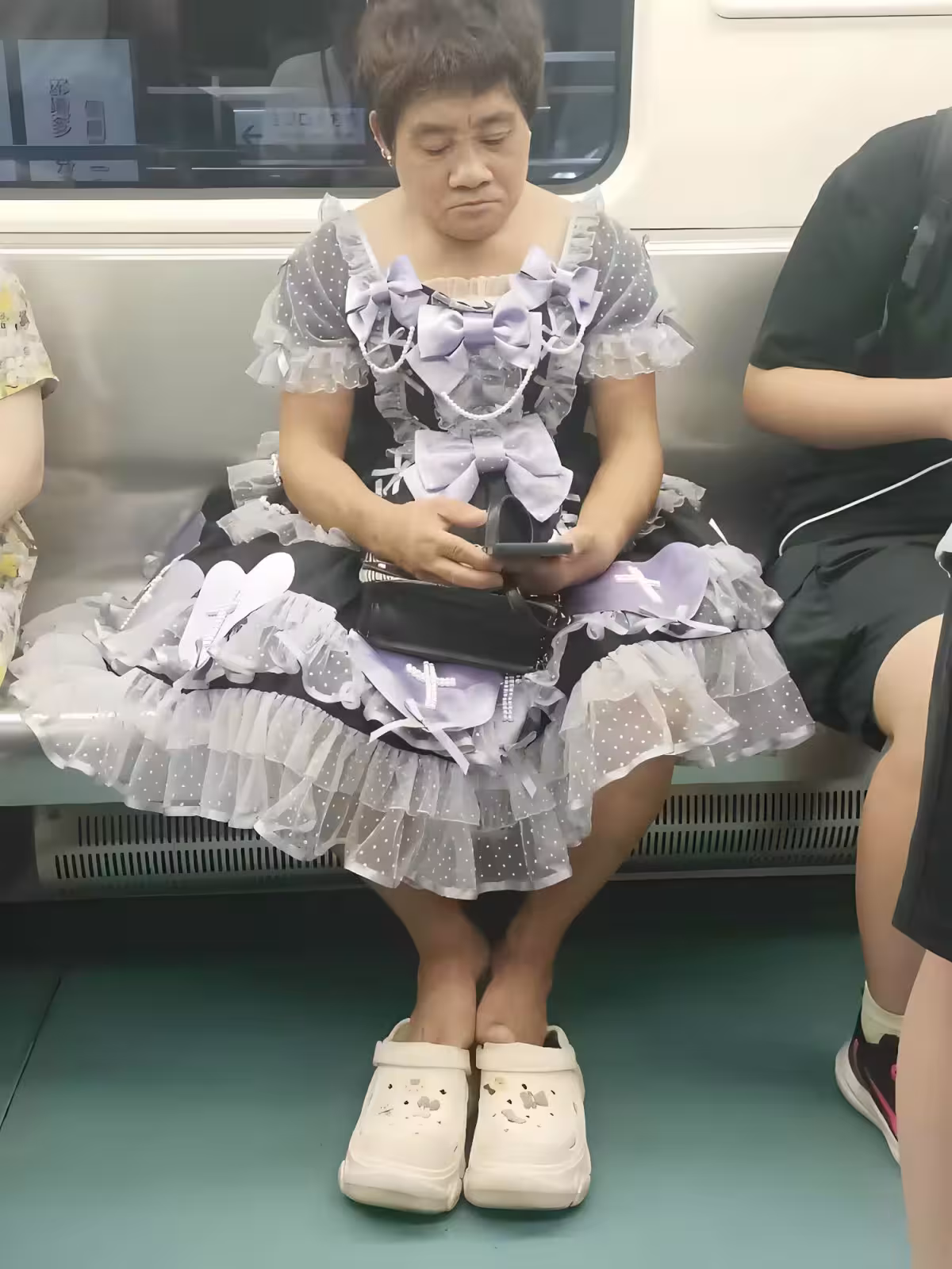 周末的捷運車廂,人流熙攘。突然,一抹扎眼的亮紫色闖入眾人的視線——一位約莫五十多歲的大媽,穿著一身極其誇張的紫色泡泡裙上了車。