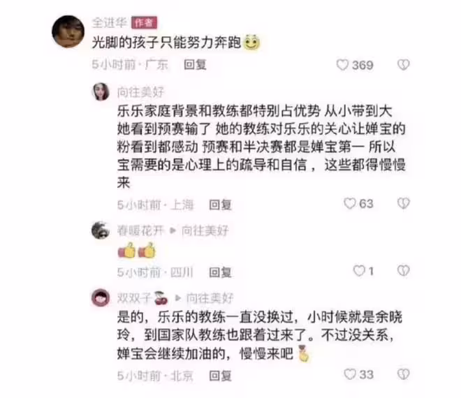 有網友突然發出截圖,全進華寫道:「光腳的孩子只能努力奔跑。」而在評論區,出現了喜歡陳芋汐的網友,為樂樂發聲,因此,他被質疑是在暗諷陳芋汐。