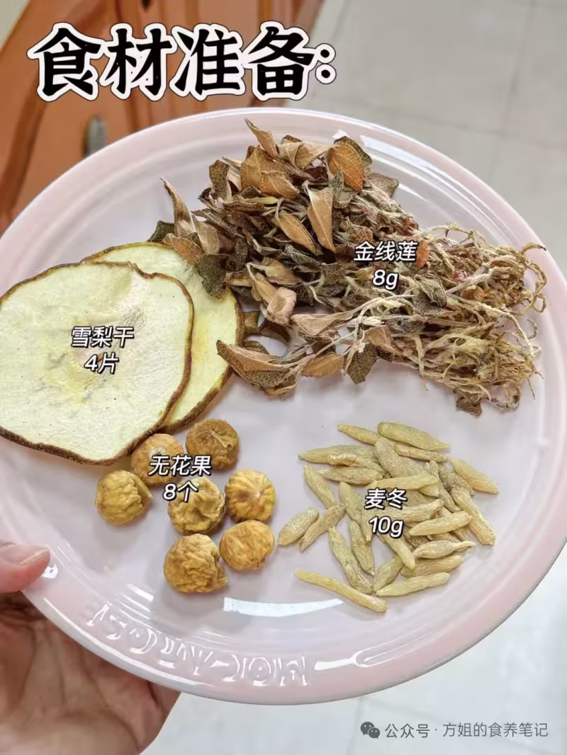 食材:麥冬10g;雪梨1個;無花果3個;金線蓮少許