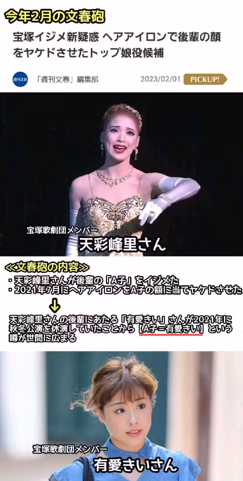有愛紀伊離世後,讓外界震驚不已,粉絲們也不敢相信,紛紛要寶冢歌舞團給一個交代;其中日本的報導,曾在10月4日、10月11日,似乎探出一些端倪;有消息指出,有愛紀伊因為待人和善、無論對學姐還是學妹,上級還是下屬,都是相當親近的態度,因此在嚴格實行「上下級制度管理」的寶冢歌舞團中,顯得格格不入,就有離開寶冢的女星曾透露,在裡面學妹對於學姐要無條件地順從、恭敬跟達成要求服侍,就連看到電車也要鞠躬,只因為「車上可能有學姐」,雖然覺得不合理,但也只能洗腦自己,能夠站上夢寐以求的舞台,這些都不算什麼了。
