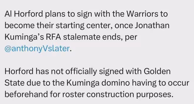 名記Slater:等到庫明加僵局結束,勇士就會簽約霍福德,後者將是球隊新賽季的首發中鋒。