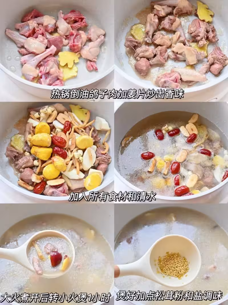 1.熱鍋倒油,放鴿子肉和薑片炒香; 2.加入蓮子、板栗、紅棗、太子參、山藥,倒入清水; 3.大火煮開後轉小火煲 1 小時; 4.煲好加松茸粉和鹽調味。