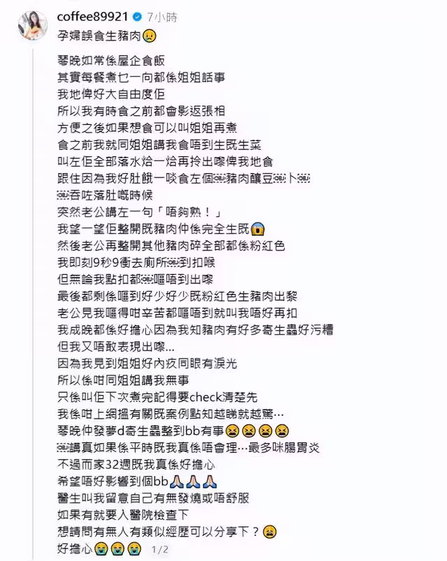 但沒想到意外還是發生了,由於孕婦本身在懷有胎兒的時候,就會經常感覺餓,林芊妤也一樣,當時她餓意來襲,沒細看就一口吞下豬肉釀豆卜,當一旁的老公告訴她不夠熟時,已經為時已晚。