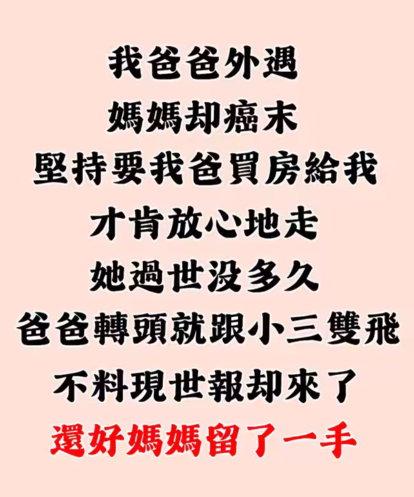 爸爸出軌!患癌媽媽臨走前「要爸爸買房給我…」媽媽走後「爸爸轉頭就跟小三雙飛」現世報卻來了