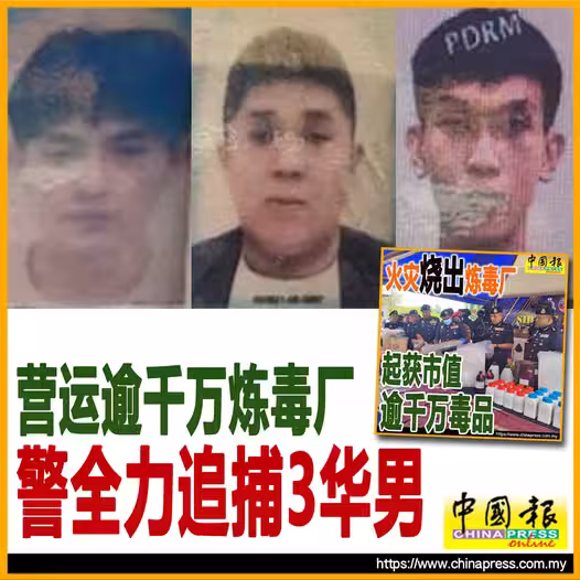 (古來24日訊)警方目前通緝3名本地華裔男子,協助調查一起涉及1952年危險毒品法令第39B條文的案件。