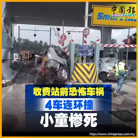 (加影27日訊)武吉加影收費站發生4車連環撞,1歲男童被拋飛車底,當場斃命,另8人受傷。
