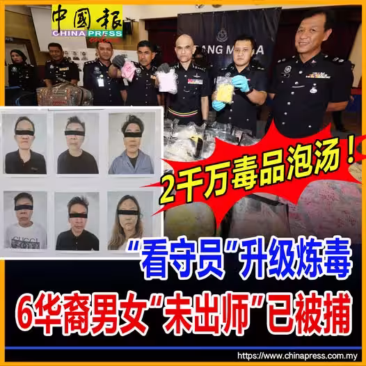 (莎阿南7日訊)6名華裔男女受僱當販毒集團看守員,隨後心癢難耐下買了煉毒化學品,想嘗試自學煉毒,結果還未來得及「自學成才」,即被警方上門突擊,6人當場落網,連同總值1976萬令吉各類毒品悉數被充公!