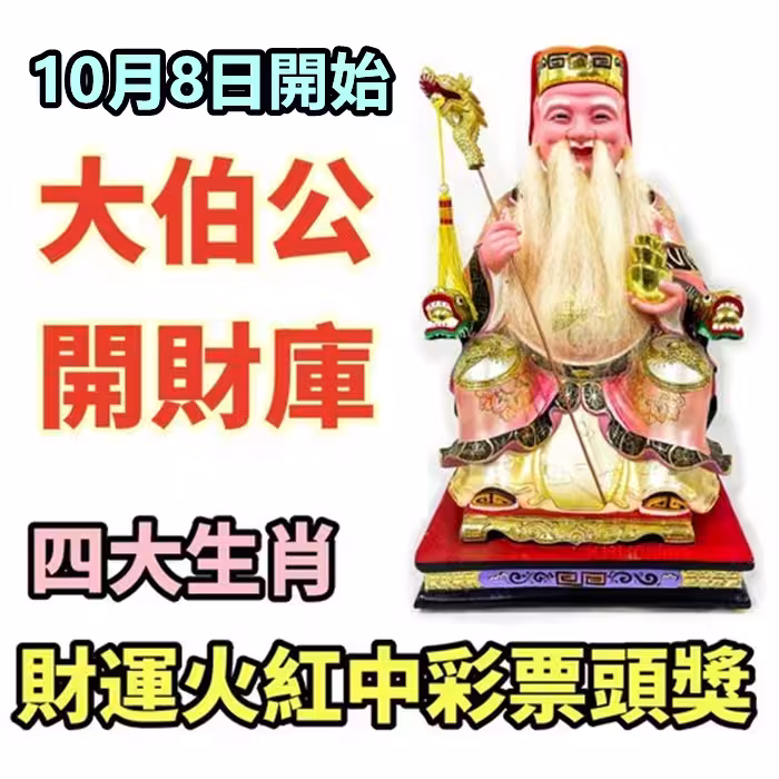 10月8日開始大伯公開財庫,四大生肖財運火紅中彩票頭獎!!