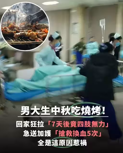 中秋吃燒烤!男大生回家狂拉「7天後竟四肢無力」急送加護「搶救換血5次」全是這原因惹禍