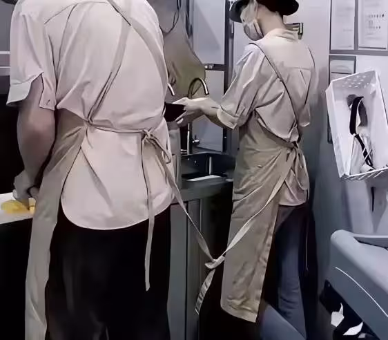 女子下意識掏出手機連拍三張,心裡直犯嘀咕:別的店一人包辦一杯,這裡卻像工廠流水線,繩子把人綁得死死的,既擋路又壓迫,效率真能高?