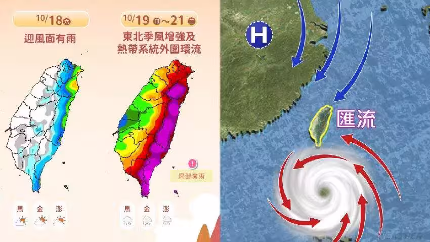 不管颱風中心有無登陸台灣,在這個季節與環境東北風產生共伴效應的額外降雨,幾乎是無法避免,「10/19至10/22,准風神距離台灣最近,風雨浪的影響也將會是最大!」
