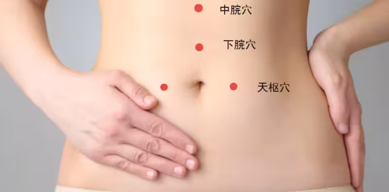 在肚臍左右兩側三指寬處,各有一個天樞穴。用拇指指腹按壓,稍稍用力,以微感酸脹為宜,順時針按壓3分鐘。