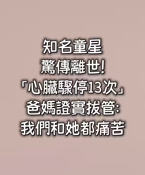 快訊/知名童星驚傳離世!「心臟驟停13次」爸媽證實拔管:我們和她都痛苦