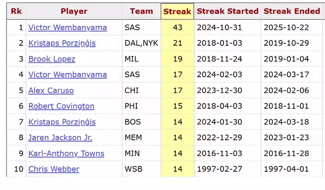止步於連續43場!文班亞馬的NBA紀錄就此中斷