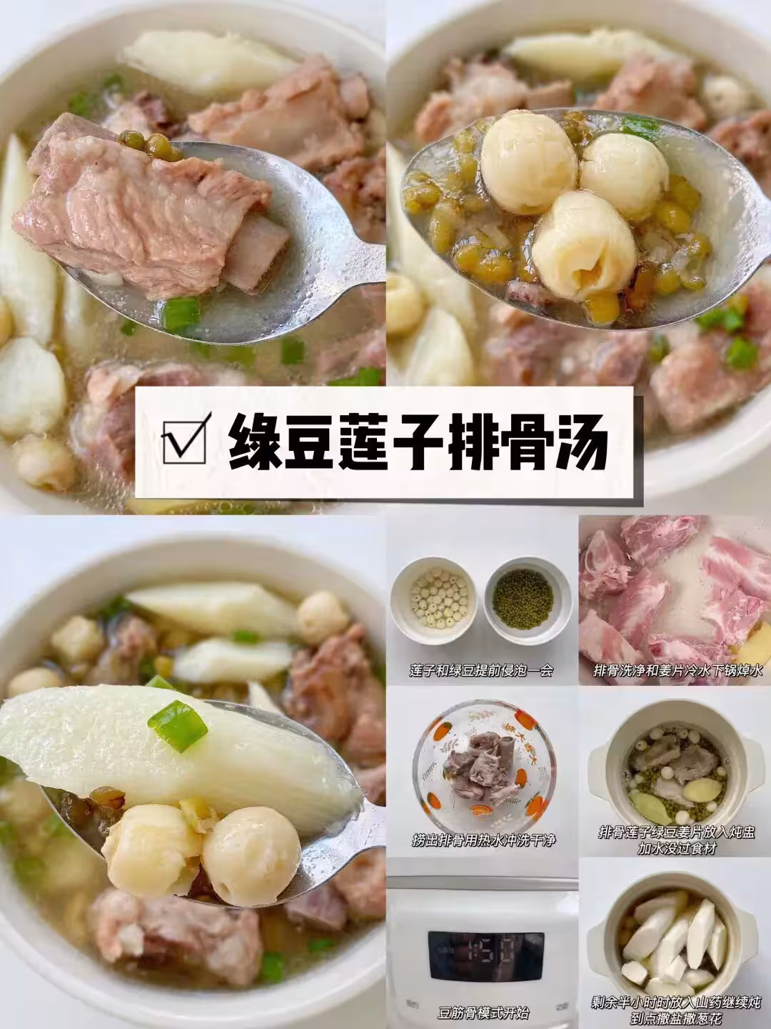 製作步驟: 蓮子和綠豆提前侵泡一會 排骨🍖洗凈和薑片冷水下鍋焯水 撈出排骨🍖用熱水沖洗乾淨 排骨蓮子綠豆薑片放入燉盅 加水沒過食材 豆筋骨模式開始 剩餘半小時時放入山藥繼續燉 到點撤鹽撒蔥花