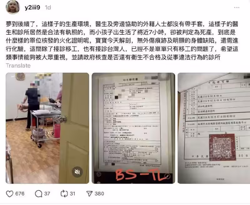 此外,據她所悉,該婦科診所的環境奇差無比,且醫療團隊在接生時竟都沒戴手套,「這樣的醫生和診所居然合法有執照?」,而除了移工,連台灣人也有在此接生,讓她非常擔心有其他受害者出現,呼籲政府重視此案,同時稽查是否仍有通過衛生部檢驗、但仍在從事非法接生的婦科診所。