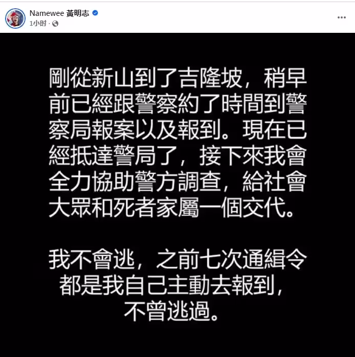 黃明志投案前在面子書貼文,指將全力協助警方調查不會逃。