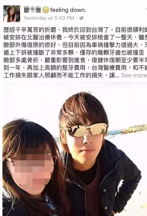 歷經千辛萬苦的折磨,我終於回到台灣了,目前很順利的被安排在北醫治療休養,今天被安排檢查了一整天,雖然臉部外傷復原的很好 但目前因為車禍撞擊力道過大,牙齒上下排被撞斷了非常多顆,僅存的幾顆牙齒也被撞歪,臉部多處骨折,嚴重影響到進食, 復健休復期至少要半年到一年,再加上高額的整牙費用,台灣醫療費用,和不能工作損失跟家人照顧而不能工作的損失,讓我非常煩惱。
