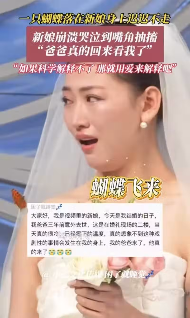 不停的左右看著在自己面前飛來飛去的胡蝶,她心理在默默的念叨著,爸爸真的來看我了,知道我今天結婚。