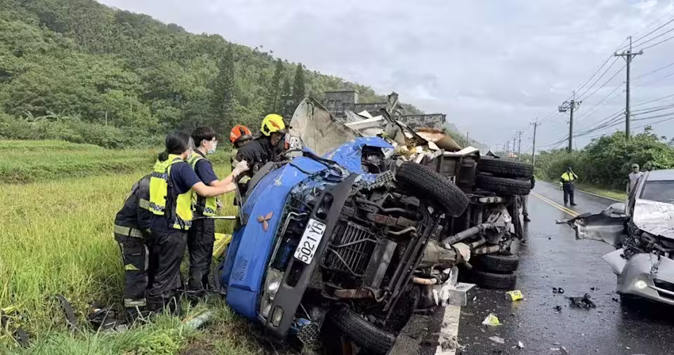 花蓮颱風天拖板吊車失控過彎 小貨車遭尾掃「翻車報廢」駕駛命危