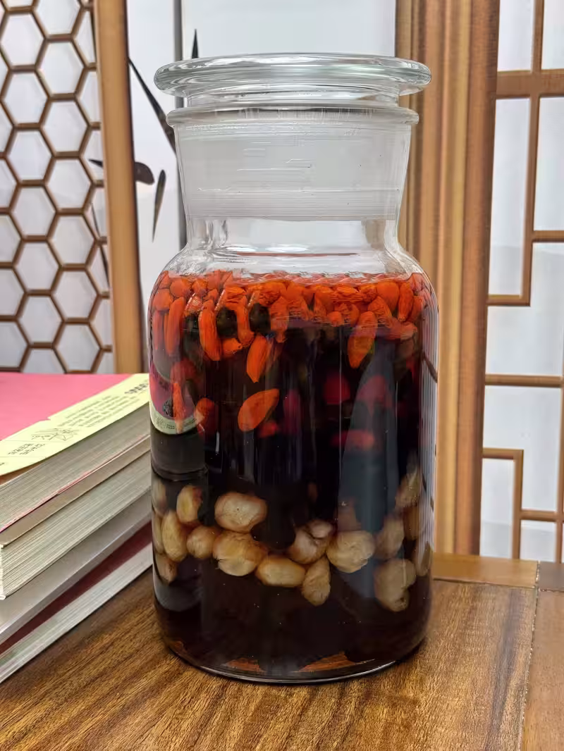 🌱材料:50克枸杞,100克冰糖,200克黑棗,100克桂圓,炒黑豆100克,1000ml52度高粱酒
