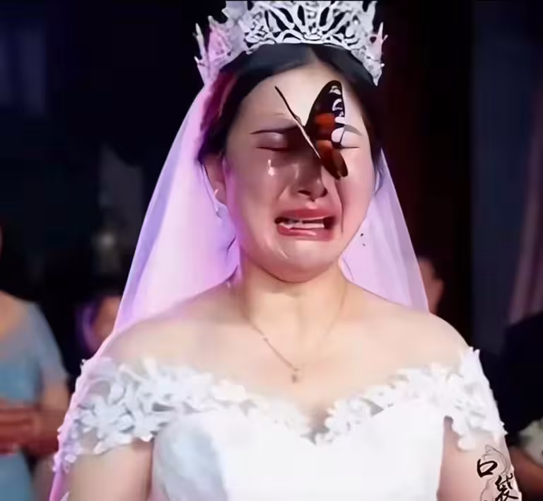剛才還在一直笑著的新娘瞬間淚崩,嘴角不停地抽動,在這個場合她強忍著淚水,不讓自己哭出聲。