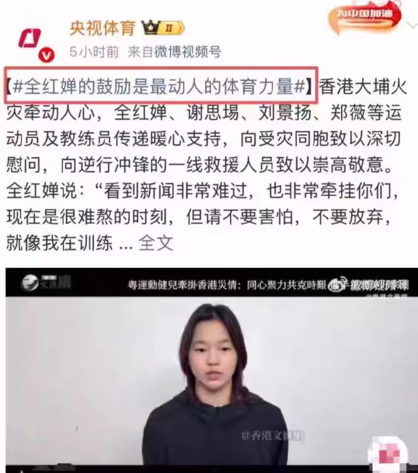 就在全紅嬋還在新疆休假時,香港火災的噩耗傳來,火勢蔓延的畫面讓人心痛不已。