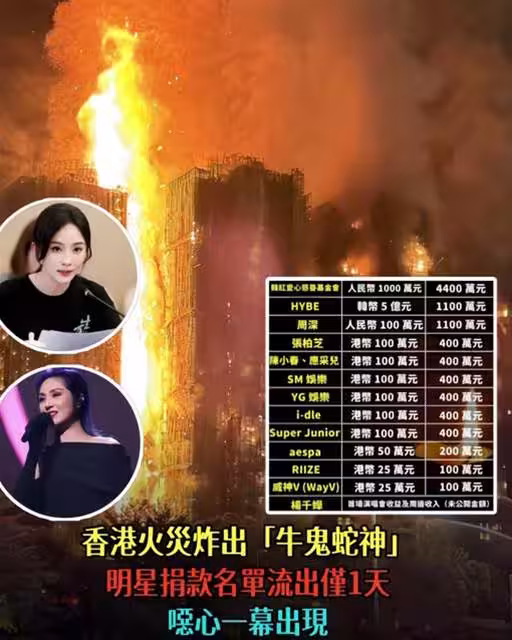香港火災炸出「牛鬼蛇神」,明星捐款名單流出僅1天,超噁心一幕出現