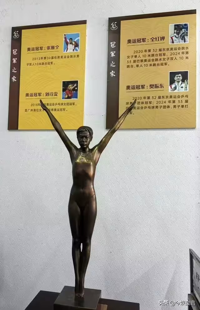 銅像穿著比賽泳衣,雙臂展開,還原的是全紅嬋準備跳水的瞬間。