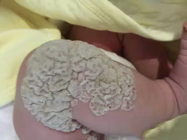 新生兒嬌嫩的大腿外側皮膚上,竟浮現出一層特殊的白色皮屑,其形態呈現出類似銀耳的半透明褶皺狀,又似細小的魚鱗緊密堆疊。
