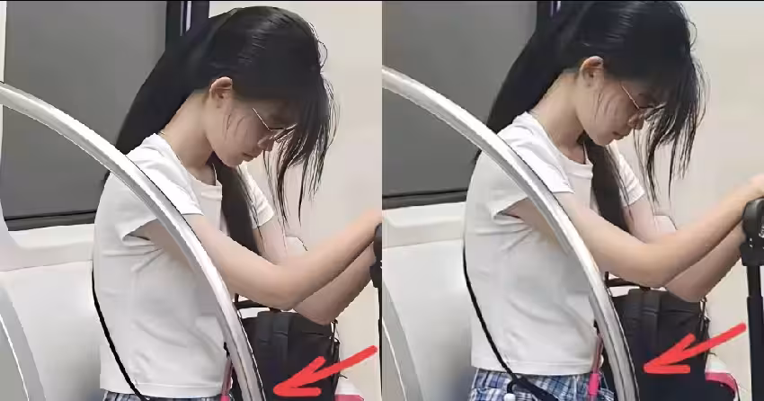 這位女孩,背著一個行李箱和兩個背包,獨自坐在捷運的角落裡。