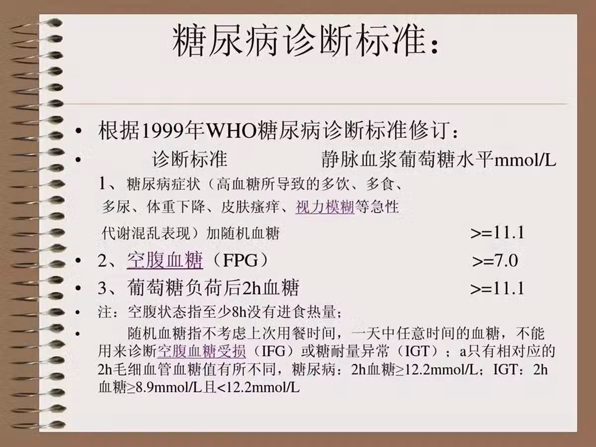 要想診斷為糖尿病,主要有3大標準,即隨機血糖>11.1mmol/L或空腹血糖>7mmol/L或葡萄糖耐量試驗血糖>11.1mmol/L。只要滿足其中的一個或者多個要求,就可以診斷為糖尿病。