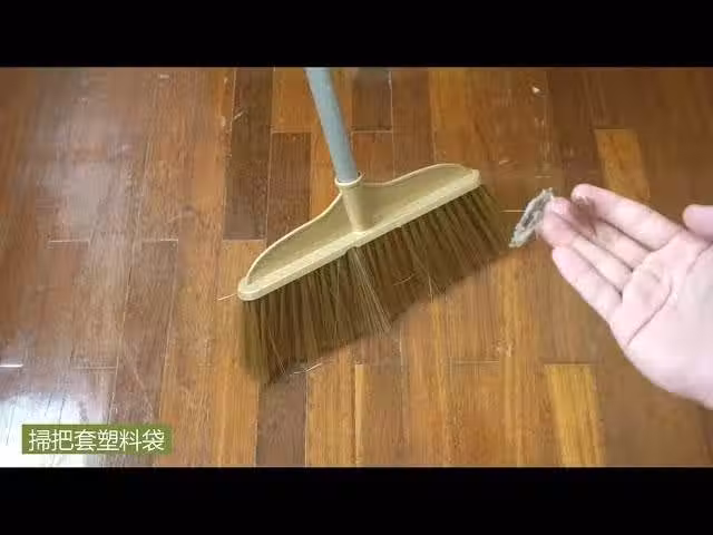 其實,要避免這樣的情況份發生非常簡單,大家只需要準備一個塑料袋,直接像這樣子把它套在掃把上就可以了。