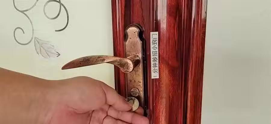 現在衛生間的門是從裡面反鎖住的,我們是打不開的,我們拿一枚硬幣過來,把硬幣的一側卡在按鈕的上面,然後旋轉一下,就能夠聽到開鎖的聲音,這時,衛生間門裡面的鎖已經打開了,這樣衛生間的門就能夠輕而易舉地打開了,一秒鐘快速地打開。