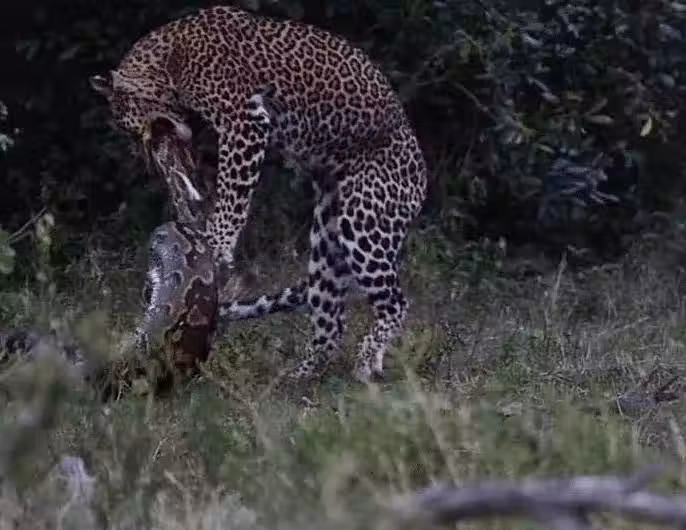 花豹在夜色下捕捉蟒蛇