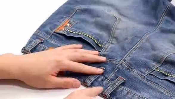 首先我們把褲子背面朝上,平放在桌子上,找到中間位置