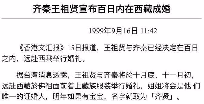 一年之後,媒體曝出王祖賢齊秦即將結婚的消息,聲稱兩個人已經取好寶寶的名字「齊賢」。