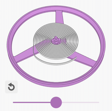 在擺輪的底部的圓盤上,你會發現另一個粉紅色的透明寶石,叫做圓盤釘。雖然很小,但這部分非常重要——當擺輪旋轉時,這顆寶石撞擊擒縱叉的另一端,進而推動擒縱叉來回擺動。讓我們首先看一下擺輪如何與其他部件相互作用的。在下面的演示中,滑塊可以減慢或加快速度: