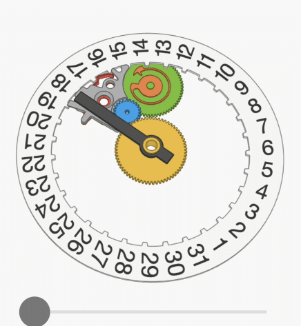 您可能想知道為什麼我們首先需要這種複雜的機制。人們可以天真地假設我們可以直接將日期環的旋轉與時輪的旋轉聯繫起來,類似於我們如何將時輪與分鐘同步旋轉,儘管速度較慢。但是,這會導致當前日期在錶盤的小窗口下不斷旋轉,難以閱讀。您可以在下面的演示中看到左側的行為: