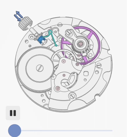 當轉動到最終位置時,止秒簧的長端會與擺輪摩擦,阻止其移動——這會使手錶停止運轉。所以,當我們將錶冠完全拉出進入時間設置模式時,止秒簧會擋住擺輪,從而使手錶停止運轉,這種動作被稱為hacking。這讓我們可以停止秒針設置時間,從而進行更精確的時間調整。