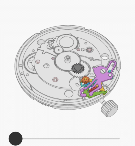 請看,日期校正器可以在該凹槽中自由滑動,當我們將錶冠拉到第二檔位並轉動它,我們最終會通過旋轉撥針輪(橙色)旋轉日期校正器,然後它可以與日期盤內側的齒嚙合。日期卡簧確保我們將日期盤鎖定在有效位置:
