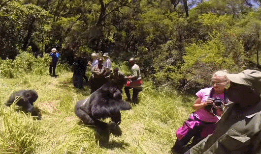 大猩猩雖然看起來很可怕,但它們又被稱作「溫柔的巨人」,只有在感受到威脅時,才會露出牙齒咆哮和做出攻擊性反應。它們在自然棲息地沒有絕對天敵,只是偶有豹子偷襲大猩猩幼崽的事情發生。唯一的潛在敵人是人類。