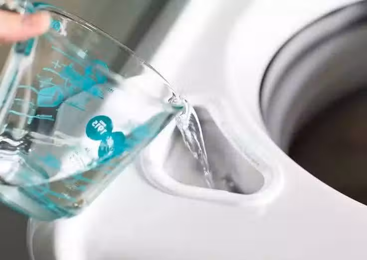 添3杯白醋在50度左右的熱水裡,將水倒入洗衣機,漫到洗衣機約1/2的位置即可!