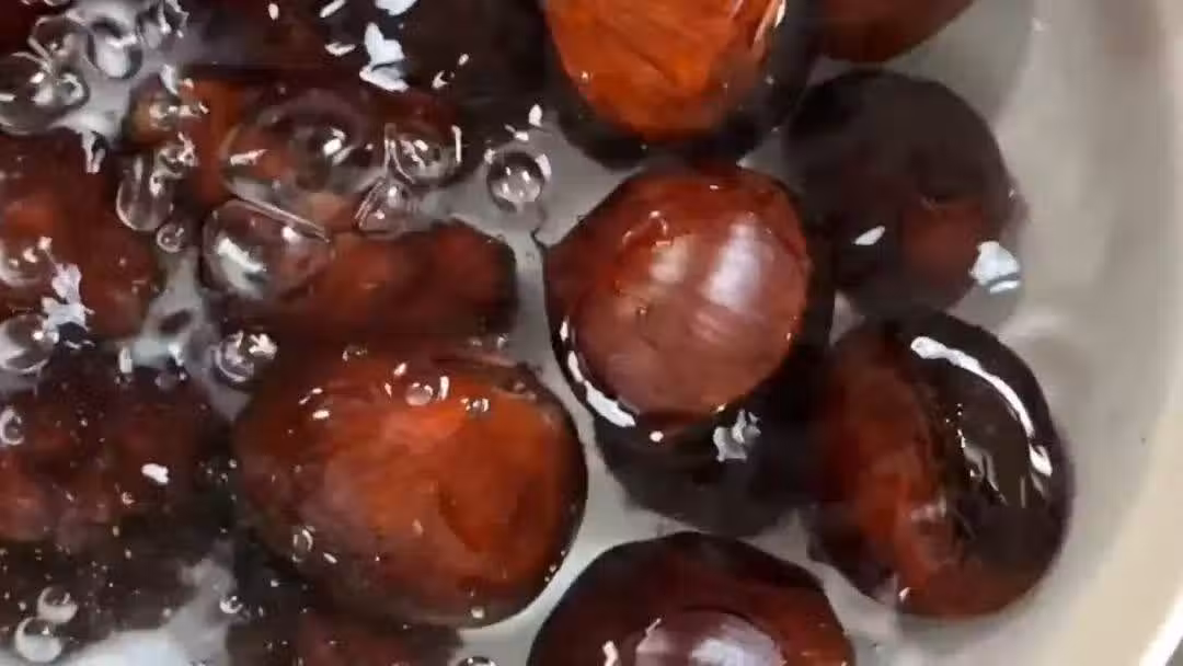 俗話說,想要甜,加點鹽,加一點鹽之後,可以讓板栗的甜味更加突出,蓋上鍋蓋煮三分鐘,如果煮熟想要直接吃的話,那麼我們煮個15分鐘,想煮出來剝殼的話,煮個三分鐘就可以。我這里煮了三分鐘。這個時候的板栗殼和板栗肉已經完全分離了,煮好的板栗連湯倒出來兩指,不燙手就可以開始剝殼了。這個時候來剝板栗殼就非常的輕鬆了,不管是外殼還是板栗肉表面的那一層剝皮都可以很輕松的完全剝離。非常的簡單快捷,只可惜運氣不好,這一個板栗是壞的,可以看到上面的蟲眼,那麼像這樣的板栗就不能要。雖然說板栗肉表面的那一層薄膜看起來顏色非常的不好看,但是營養非常的豐富。因此咱們平時自己在家烹飪的時候,盡量保留上面的薄膜,不要撕掉了,不管是燉肉還是煲湯,我們只需要將它的外殼,這樣脫去就可以,裡面的內膜沒必要脫去。
